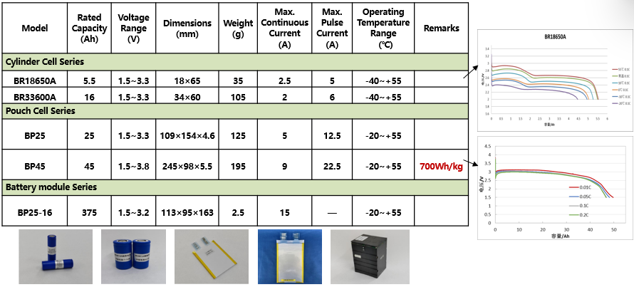 Extremely high energy density; very low self-discharge rate; wide operating temperature range; excellent storage life and reliability; stable operating voltage.
